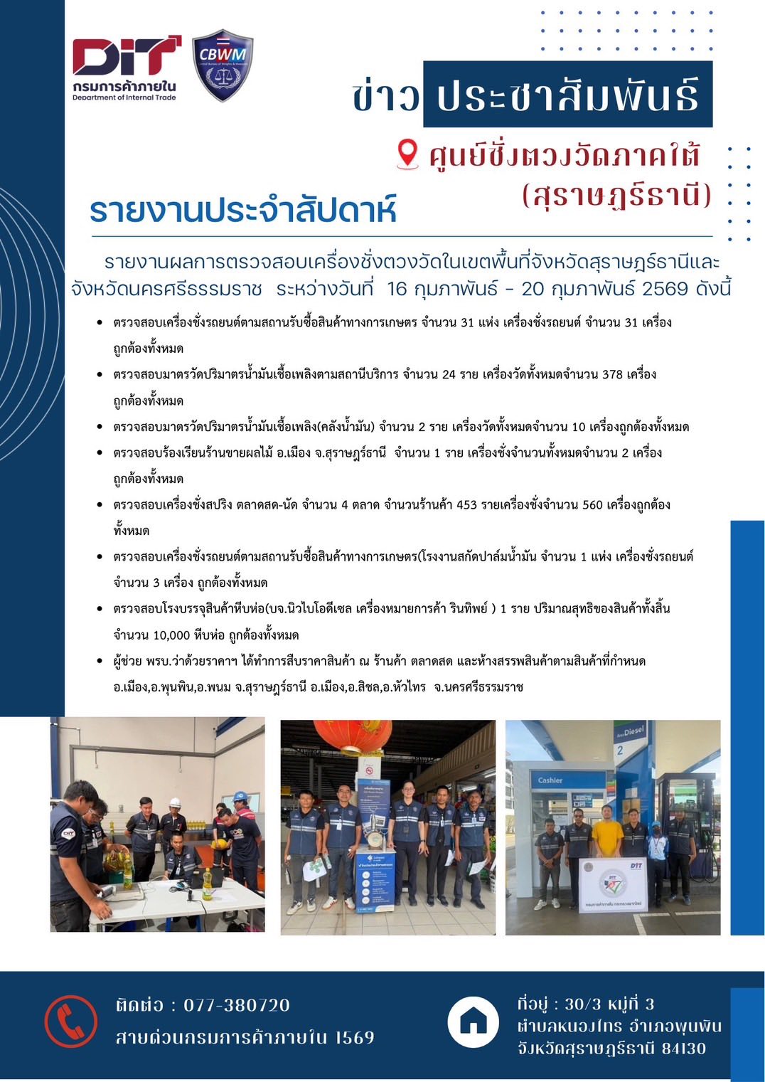 ศูนย์ชั่งตวงวัดภาคใต้(สุราษฎร์ธานี) ระหว่างวันที่ 16 กุมภาพันธ์ - 20 กุมภาพันธ์ 2569 ดังนี้ ตรวจสอบเครื่องชั่งรถยนต์ตามสถานรับซื้อสินค้าทางการเกษตร จำนวน 31 แห่ง เครื่องชั่งรถยนต์ จำนวน 31 เครื่อง ถูกต้องทั้งหมด ตรวจสอบมาตรวัดปริมาตรน้ำมันเชื้อเพลิงตามสถานีบริการ จำนวน 24 ราย เครื่องวัดทั้งหมดจำนวน 378 เครื่อง ถูกต้องทั้งหมด ตรวจสอบมาตรวัดปริมาตรน้ำมันเชื้อเพลิง(คลังน้ำมัน) จำนวน 2 ราย เครื่องวัดทั้งหมดจำนวน 10 เครื่องถูกต้องทั้งหมด ตรวจสอบร้องเรียนร้านขายผลไม้ อ.เมือง จ.สุราษฎร์ธานี จำนวน 1 ราย เครื่องชั่งจำนวนทั้งหมดจำนวน 2 เครื่องถูกต้องทั้งหมด ตรวจสอบเครื่องชั่งสปริง ตลาดสด-นัด จำนวน 4 ตลาด จำนวนร้านค้า 453 รายเครื่องชั่งจำนวน 560 เครื่องถูกต้องทั้งหมด ตรวจสอบเครื่องชั่งรถยนต์ตามสถานรับซื้อสินค้าทางการเกษตร(โรงงานสกัดปาล์มน้ำมัน จำนวน 1 แห่ง เครื่องชั่งรถยนต์ จำนวน 3 เครื่อง ถูกต้องทั้งหมด ตรวจสอบโรงบรรจุสินค้าหีบห่อ(บจ.นิวไบโอดีเซล เครื่องหมายการค้า รินทิพย์ ) 1 ราย ปริมาณสุทธิของสินค้าทั้งสิ้น จำนวน 10,000 หีบห่อ ถูกต้องทั้งหมด ผู้ช่วย พรบ.ว่าด้วยราคาฯ ได้ทำการสืบราคาสินค้า ณ ร้านค้า ตลาดสด และห้างสรรพสินค้าตามสินค้าที่กำหนด อ.เมือง,อ.พุนพิน,อ.พนม จ.สุราษฎร์ธานี อ.เมือง,อ.สิชล,อ.หัวไทร จ.นครศรีธรรมราช #ป้องกันการเอารัดเอาเปรียบผู้บริโภค หากพบเห็นการกระทำผิดเกี่ยวกับเครื่องชั่งตวงวัดและสินค้าหีบห่อ #สามารถแจ้งได้ที่ #ศูนย์ชั่งตวงวัดภาคใต้ (สุราษฎร์ธานี) : 077-380720 #สายด่วนกรมการค้าภายใน 1569