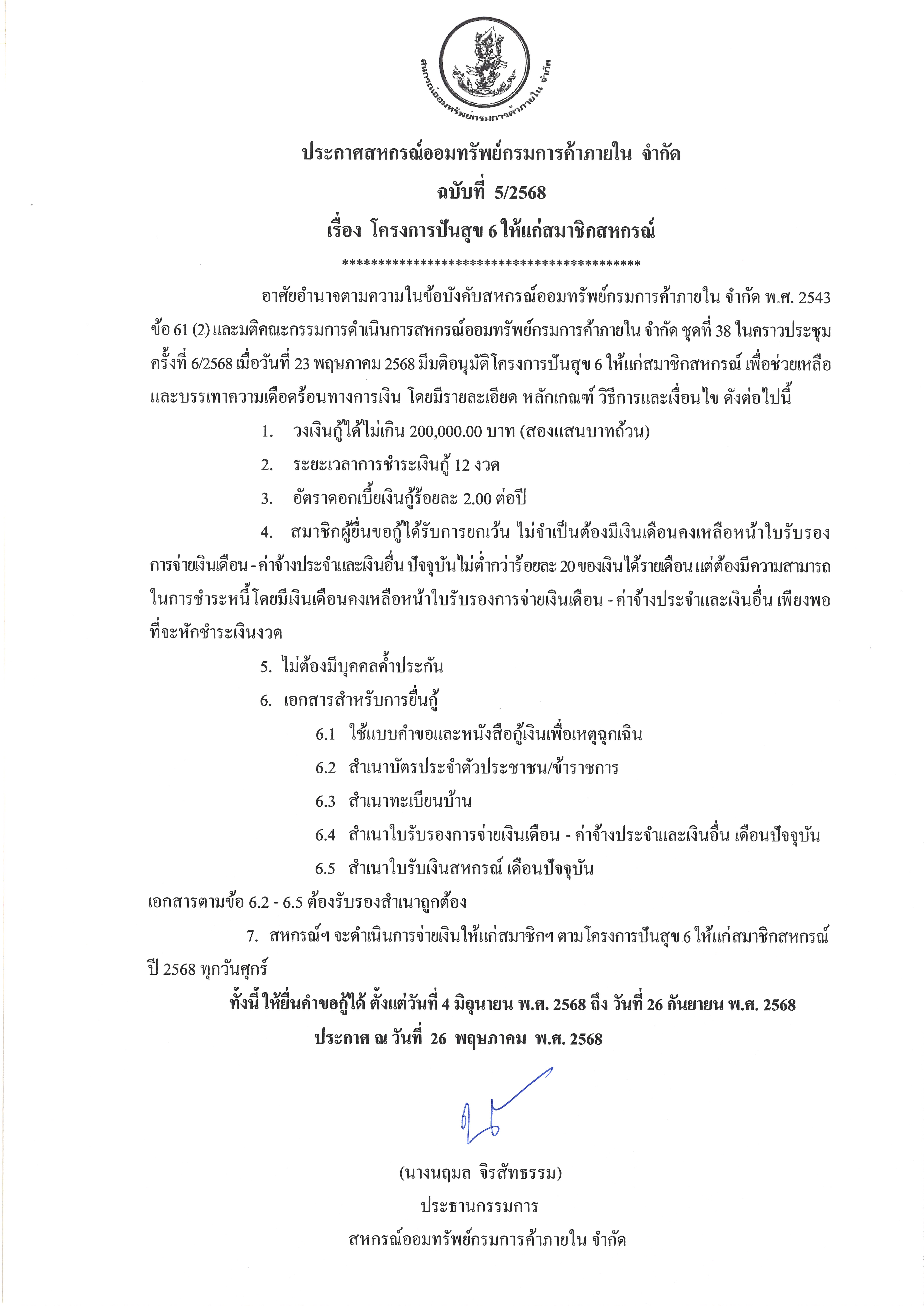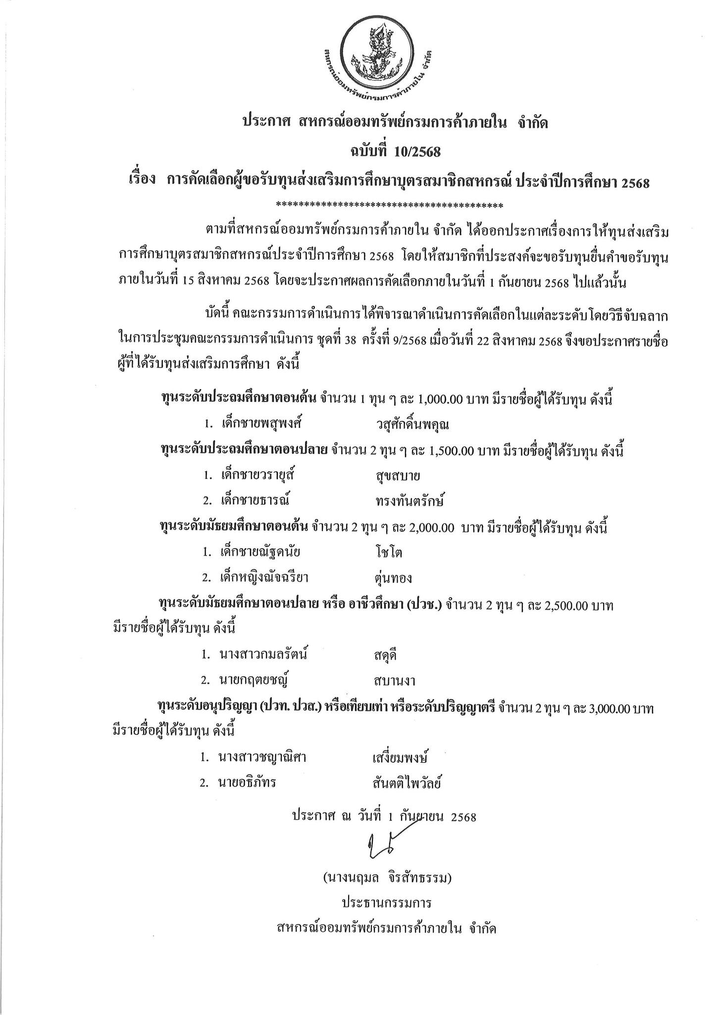 ประกาศสหกรณ์ ฉบับที่ 10/2568 เรื่อง การคัดเลือกผู้ขอรับทุนส่งเสริมการศึกษาบุตรสมาชิกสหกรณ์ ประจำปีการศึกษา 2568