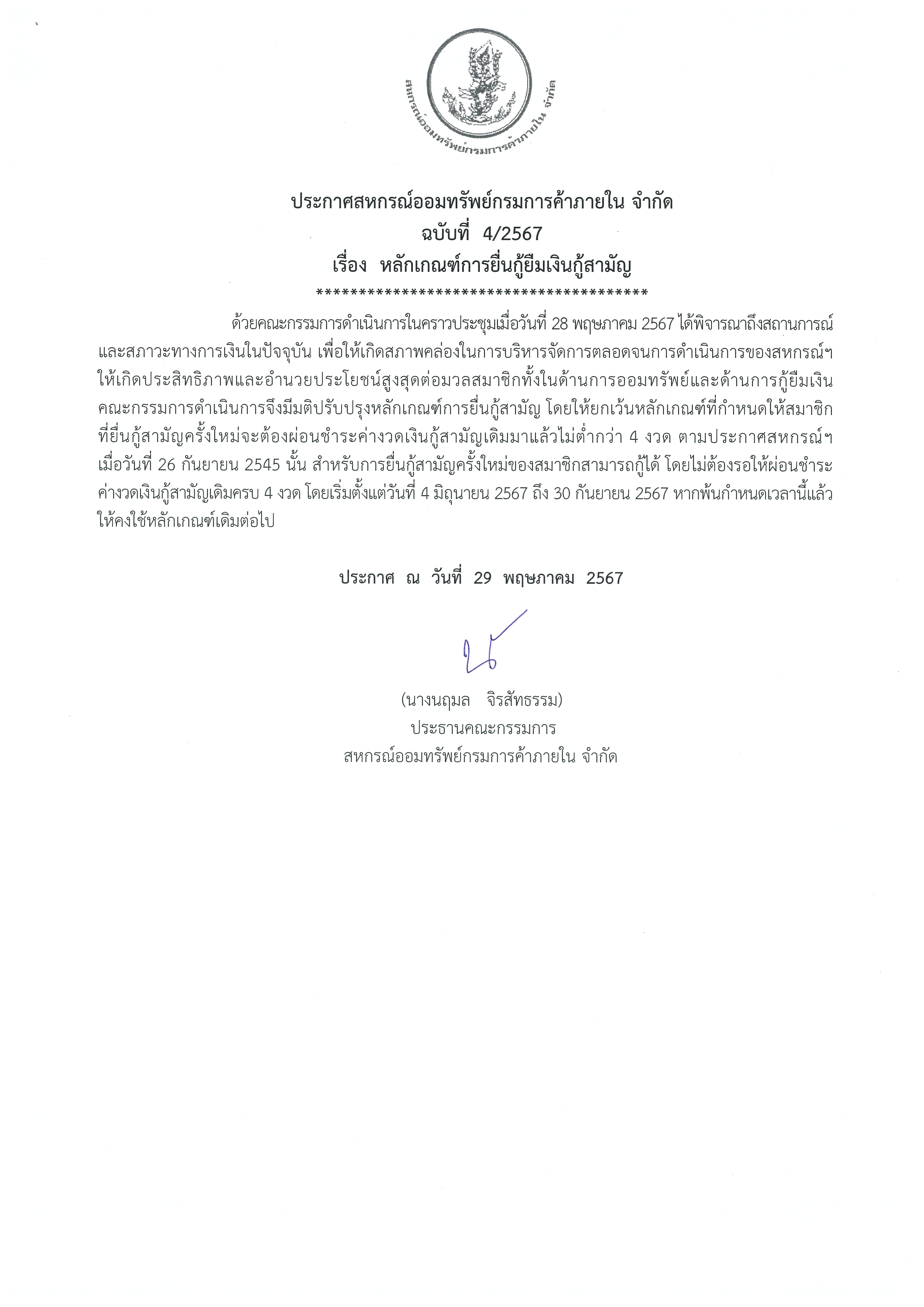 ประกาศสหกรณ์ ฉบับที่ 7/2567 เรื่อง อัตราค่าเบี้ยประกันชีวิตกลุ่มเพื่อลดภาระผู้ค้ำประกัน ปี 2567/2568