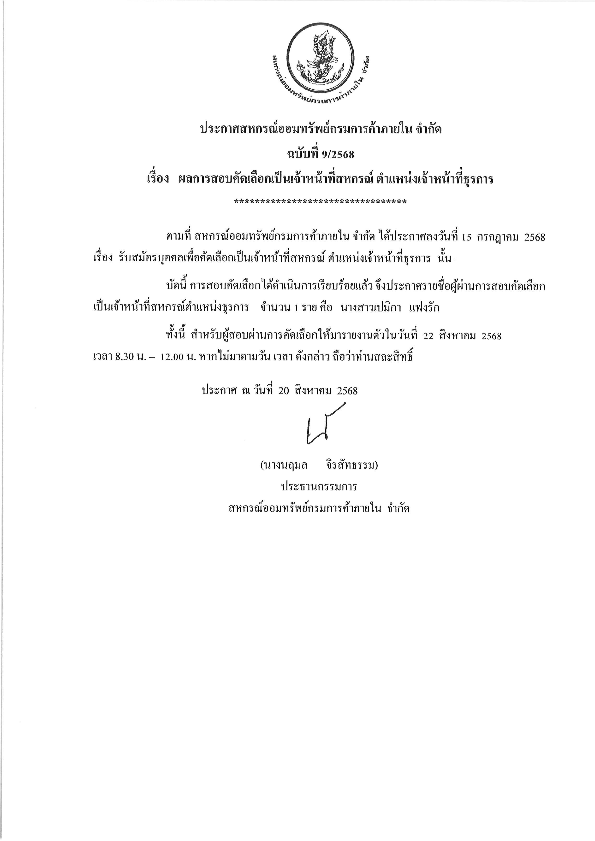 ประกาศสหกรณ์ ฉบับที่ 9/2568 เรื่อง ผลการสอบคัดเลือกเป็นเจ้าหน้าที่สหกรณ์ ตำแหน่งเจ้าหน้าที่ธุรการ