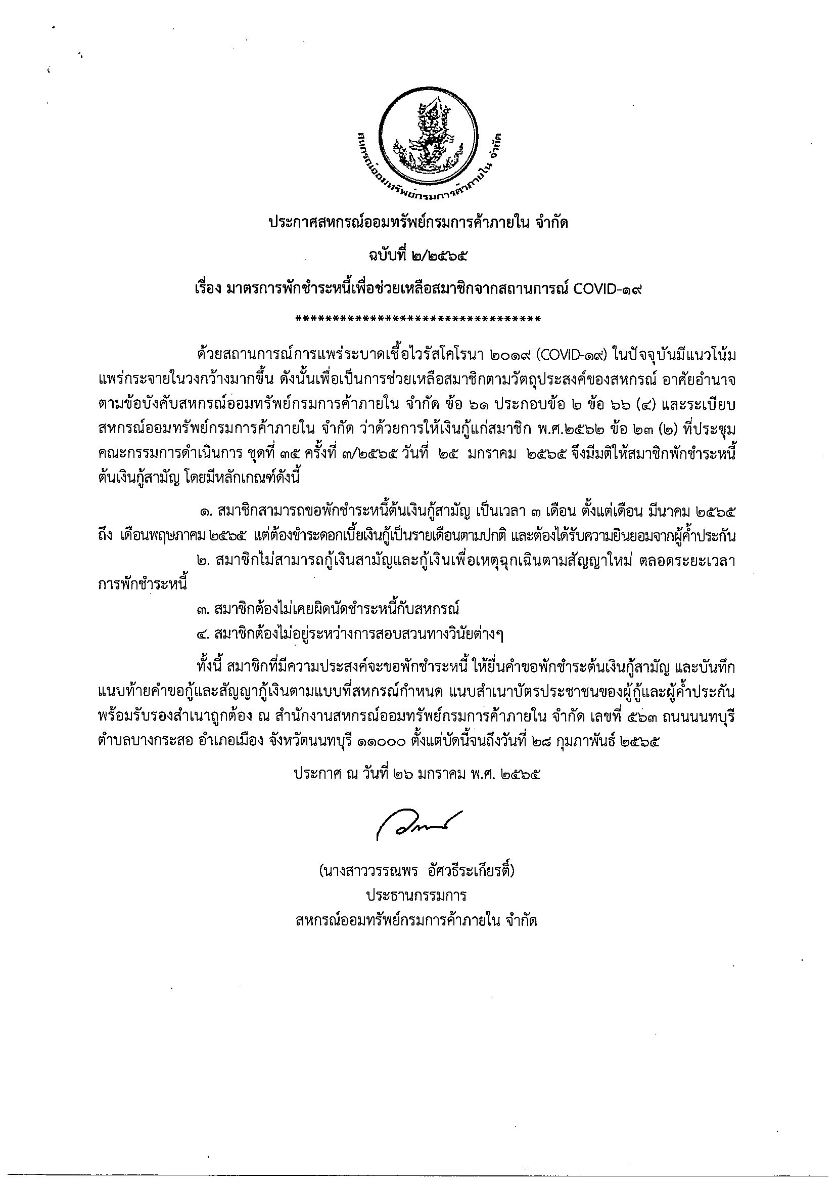 ประกาศสหกรณ์ ฉบับที่ 2/2565 เรื่อง มาตรการพักชำระหนี้เพื่อช่วยเหลือสมาชิกจากสถานการณ์ COVID-19