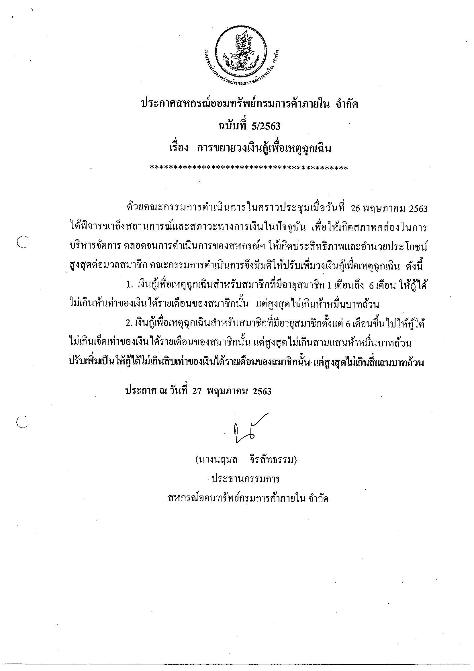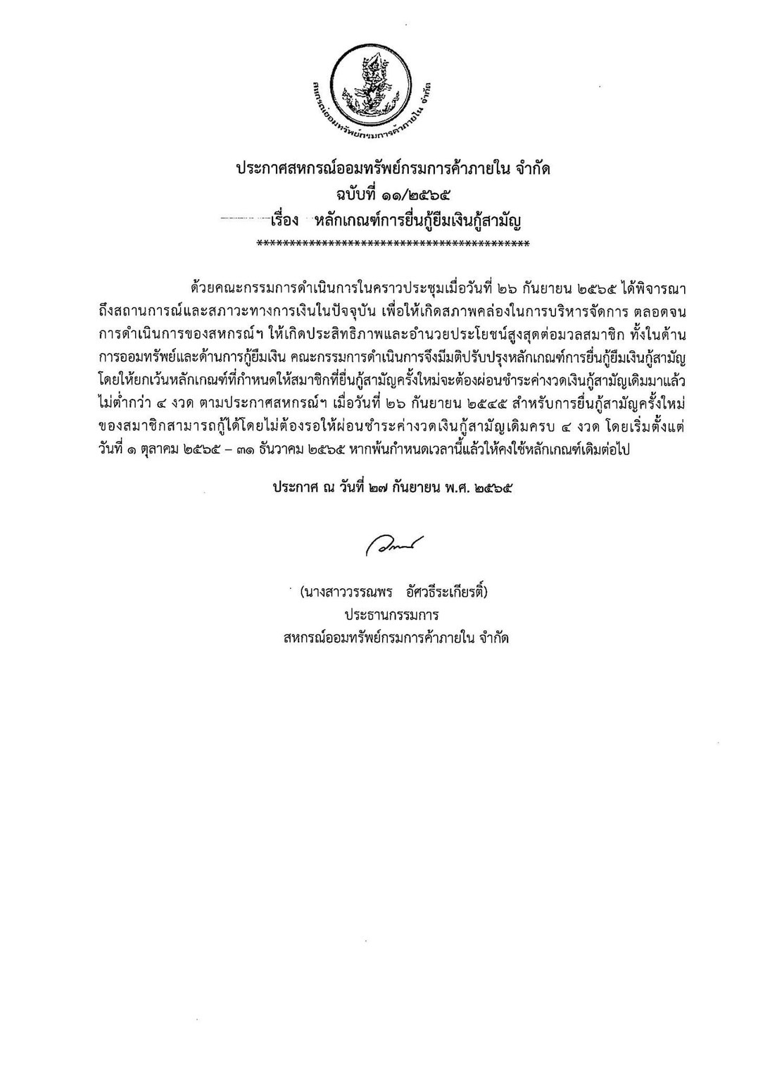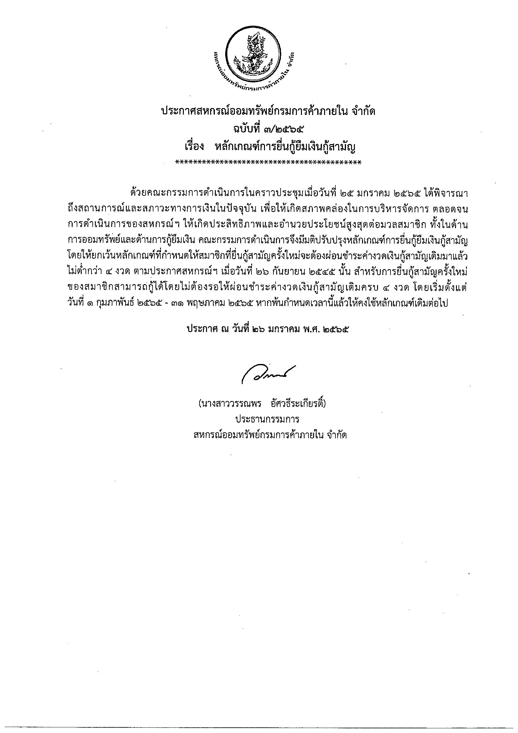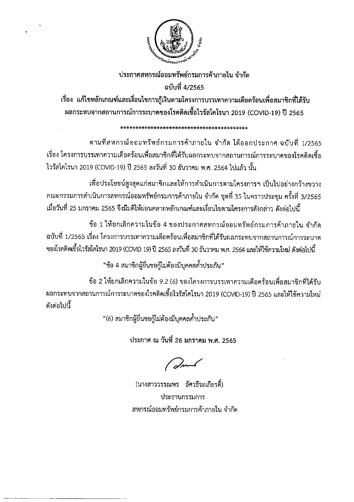 ประกาศสหกรณ์ ฉบับที่ 4/2565 เรื่อง แก้ไขหลักเกณฑ์และเงื่อนไขการกู้เงินตามโครงการบรรเทาความเดือดร้อน เพื่อสมาชิกที่ได้รับผลกระทบจากสถานการณ์การระบาดของโรคติดเชื้อไวรัสโคโรนา 2019 (COVID-19) ปี 2565
