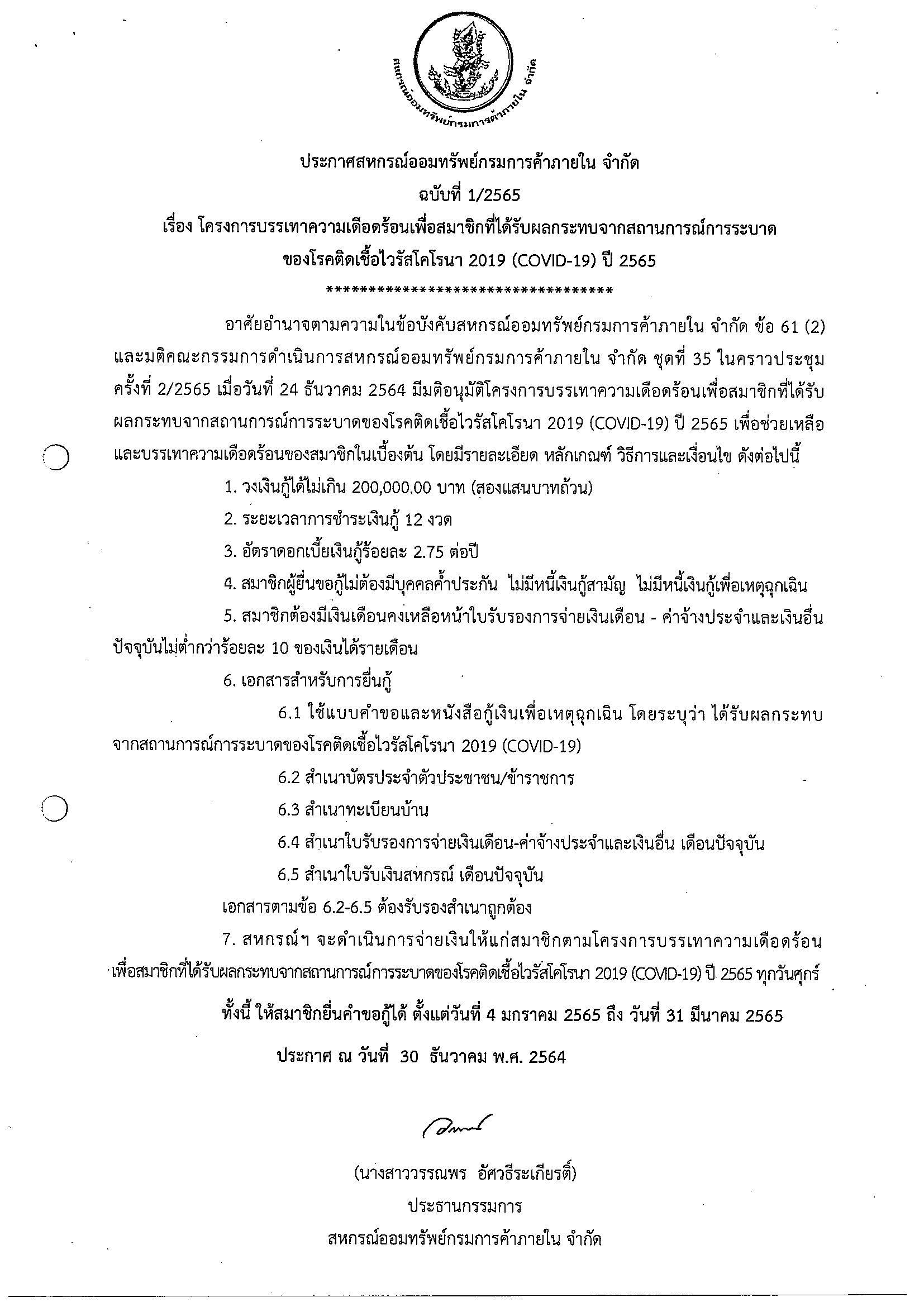 ประกาศสหกรณ์ ฉบับที่ 1/2565 เรื่อง โครงการบรรเทาความเดือดร้อนเพื่อสมาชิกที่ได้รับผลกระทบจากสถานการณ์ การระบาดของโรคติดเชื้อไวรัสโคโรนา 2019 (COVID-19) ปี 2565