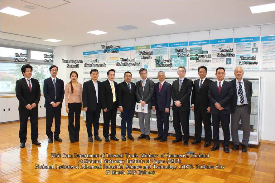 นายฉัตรชัย ศักดิ์ศิลปชัย รองอธิบดีกรมการค้าภายใน พร้อมคณะผู้แทน กรมการค้าภายในได้เดินทางศึกษาดูงานด้านชั่งตวงวัดและระบบมาตรวิทยาของสถาบันมาตรวิทยาแห่งชาติของประเทศญี่ปุ่น (National Metrology Institute of Japan : NMIJ) โดยมี Dr.Takashi Usuda ผู้อำนวยการของสถาบันฯ และผู้บริหารระดับสูงของสถาบันวิจัยวิทยาศาสตร์และเทคโนโลยีเพื่ออุตสาหกรรมขั้นสูงแห่งชาติของประเทศญี่ปุ่น (National Institute of Advanced Industrial Science and Technology : AIST) ให้การต้อนรับคณะผู้แทนจากกรมเป็นอย่างดี ทางสถาบันมาตรวิทยาแห่งชาติและชั่งตวงวัด ของประเทศญี่ปุ่นได้นำเยี่ยมชมห้องปฏิบัติการตรวจสอบต้นแบบเครื่องชั่งตวงวัดประเภทต่างๆ ตัวอย่างเช่น การตรวจสอบต้นแบบเครื่องชั่งไม่อัตโนมัติ การตรวจสอบต้นแบบมาตรวัดปริมาตรน้ำ การตรวจสอบต้นแบบมาตรวัดก๊าซที่ใช้ในครัวเรือน การตรวจสอบต้นแบบส่วนรับน้ำหนัก (Load cell) ณ ประเทศญี่ปุ่น ในระหว่างวันที่ 27 มีนาคม ถึงวันที่ 1 เมษายน 2562